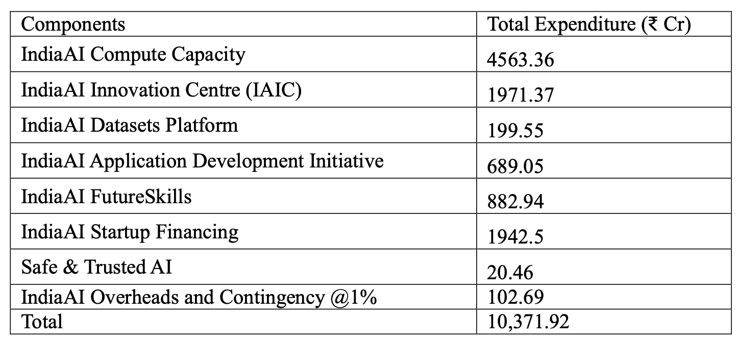 Here is a split of the total budget allocation across the different pillars of the IndiaAI mission that was shared in response to a Lok Sabha question that was shared in Dec ‘24.