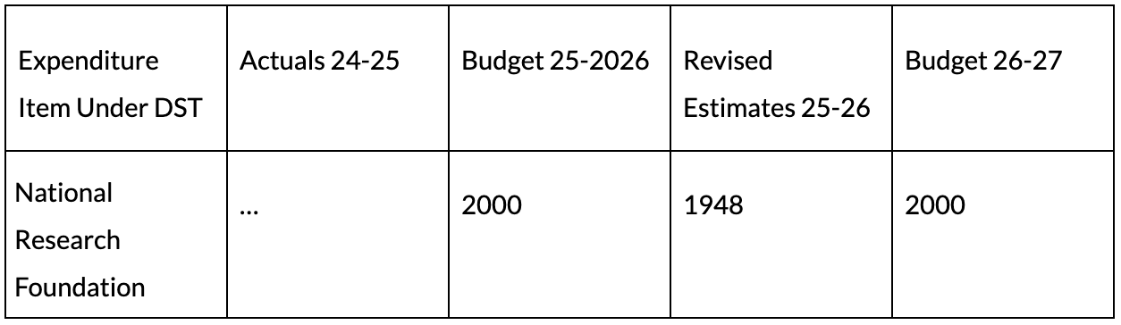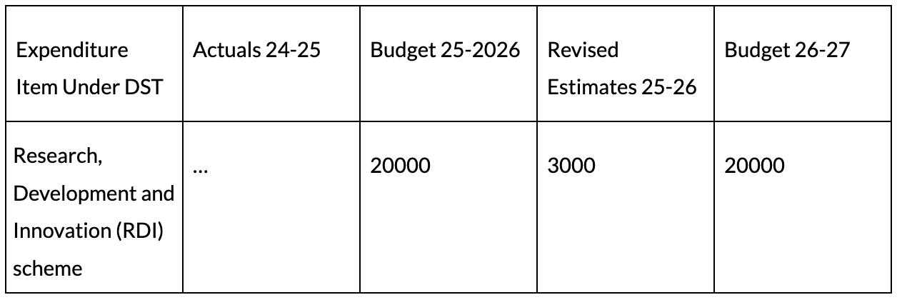 The scheme aims to strengthen India’s capabilities in strategic technologies and promote technological self-reliance. It focuses on technologies that are at advanced stages of development (technology readiness levels 4 and above). It will also facilitate setting up a Deep-Tech Fund of Funds. The scheme aims to catalyse private sector investment in R&D with a total outlay of ₹1 lakh crore over six years. The budget amount for FY26-27 is ₹20,000.