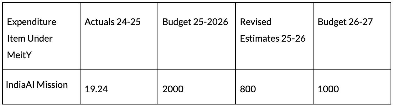 The revised expenditure estimates for the India AI mission have come down from the budgeted ₹2,000 crores to 800 crores for 25-26. The budget for 26-27 is also similar at ₹1,000 crores. This seems lower than the 10,300 crores that were allocated under the mission over a five-year period.